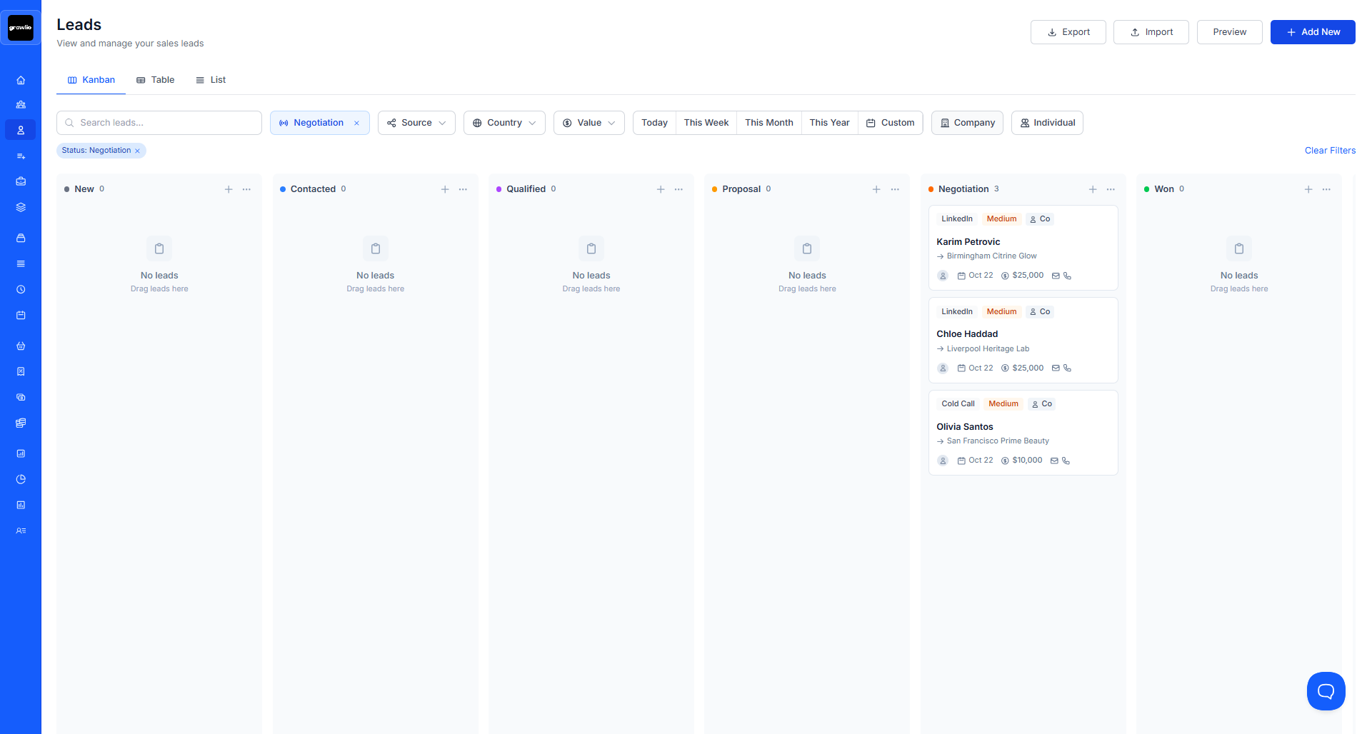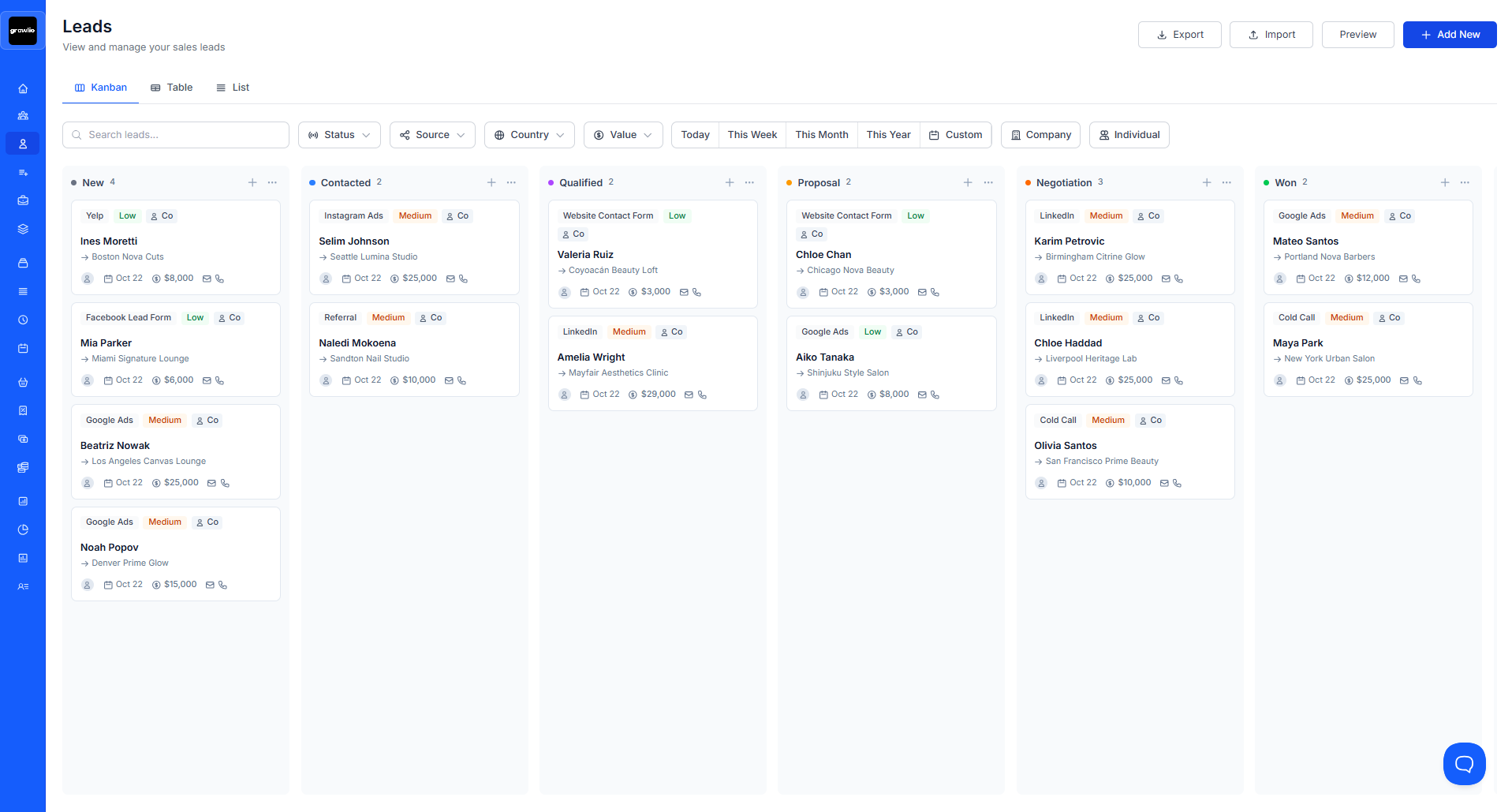 The Kanban board is growlio's visual sales pipeline that helps you track leads through every stage of your sales process. Organize leads by status, drag and drop cards between columns, and get a clear overview of your entire pipeline at a glance. This guide explains how to use the Kanban board effectively.