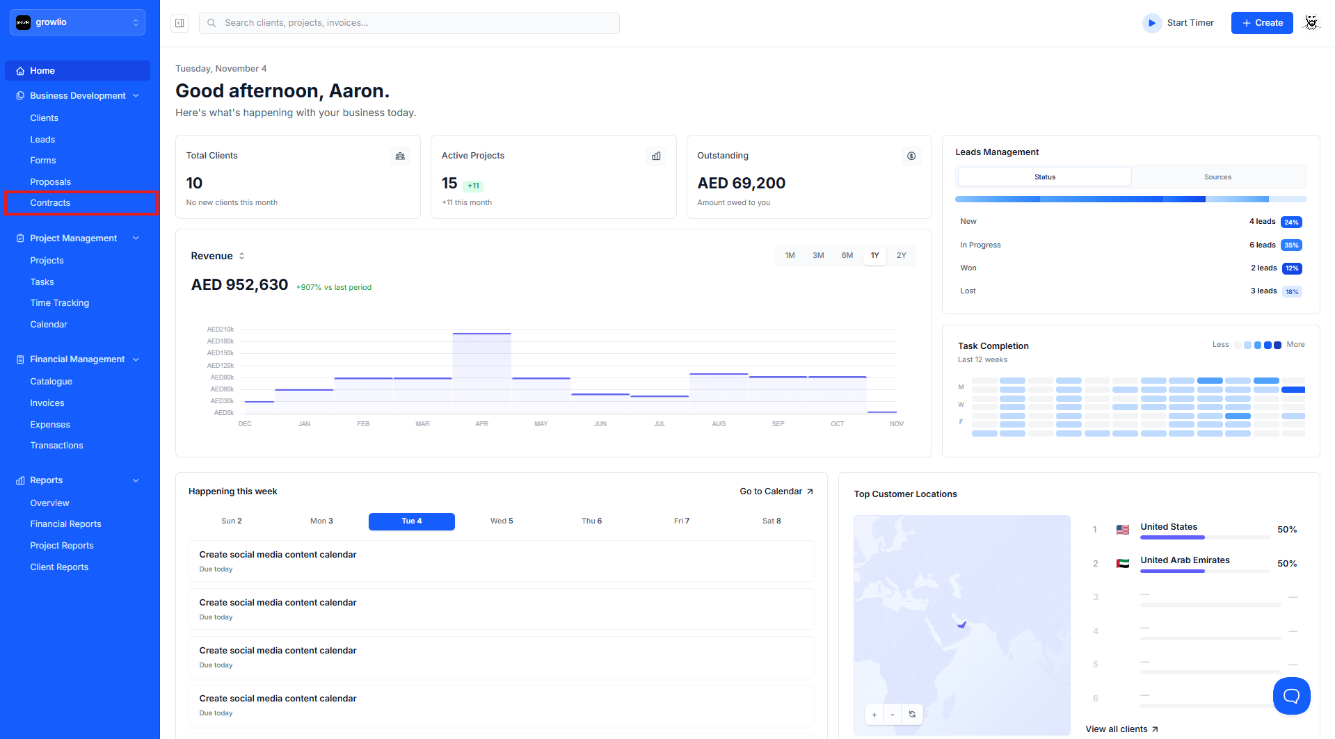 Contracts are essential for formalizing business relationships and protecting both you and your clients. growlio's contract system provides professional templates that you can customize with client information, terms, and digital signature capabilities. This guide shows you how to create and configure a new contract.
