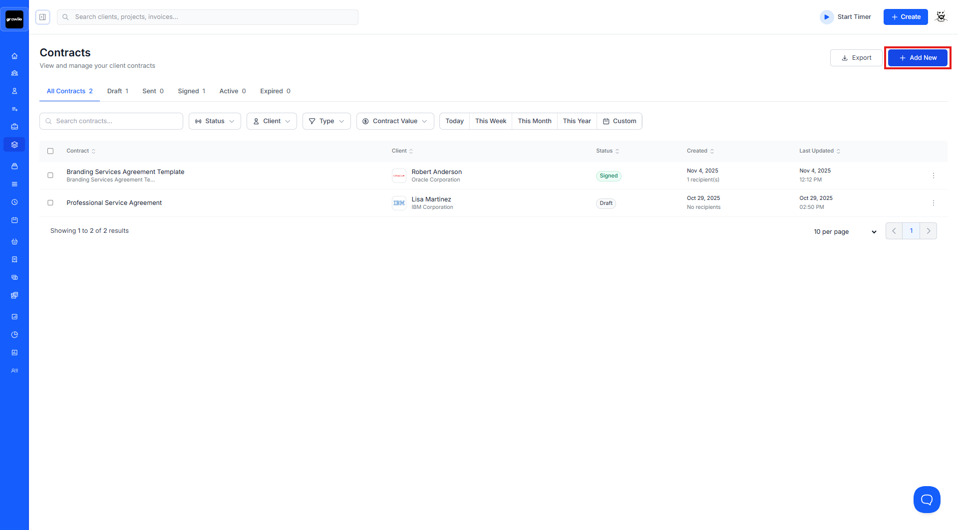 In the top-right corner, click the blue Add New button to open the contract creation modal.