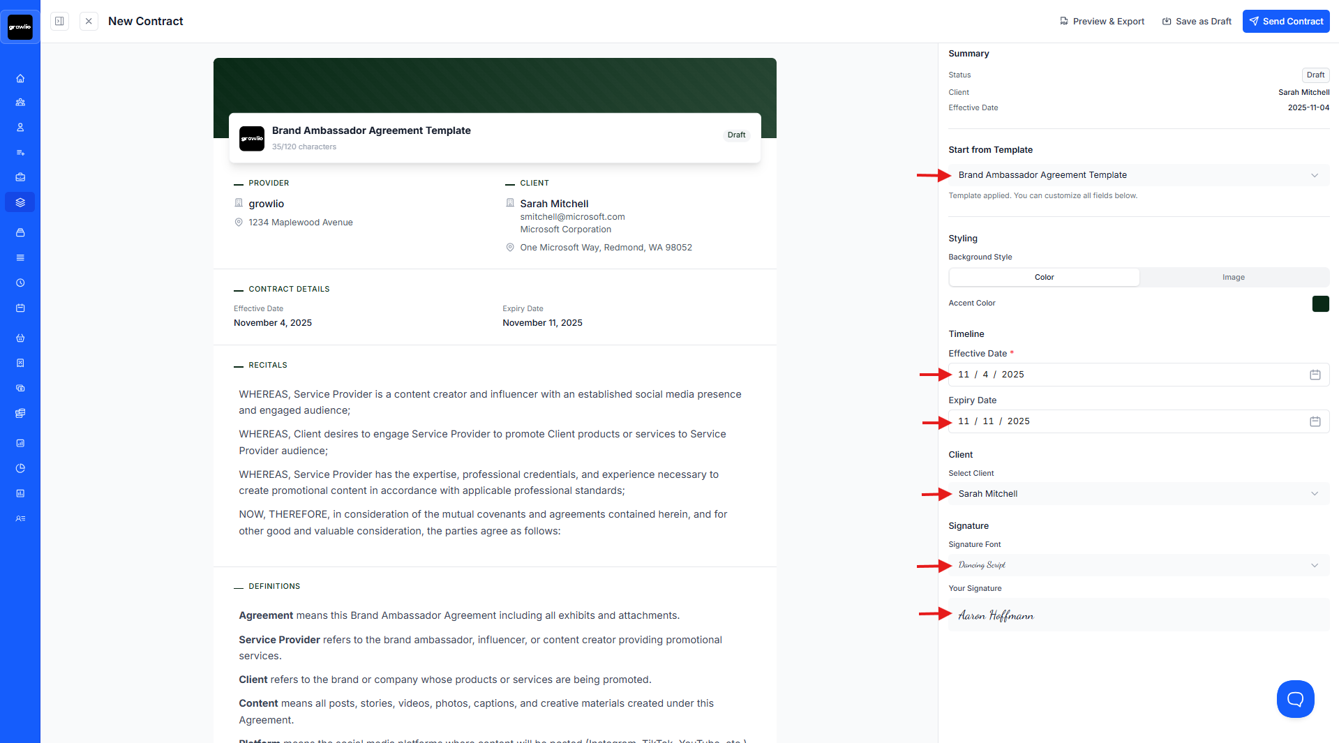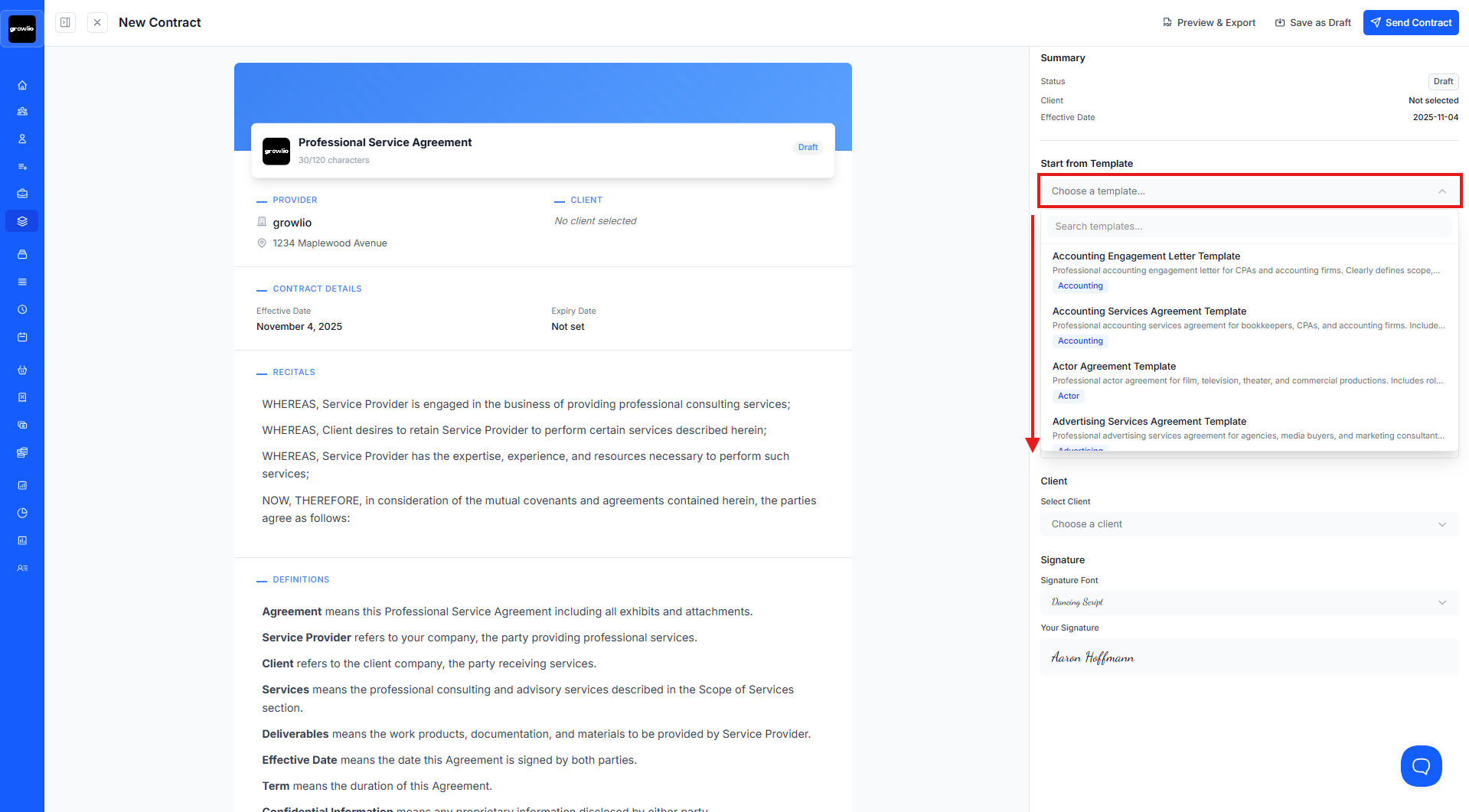 growlio provides several professional contract templates to get you started: