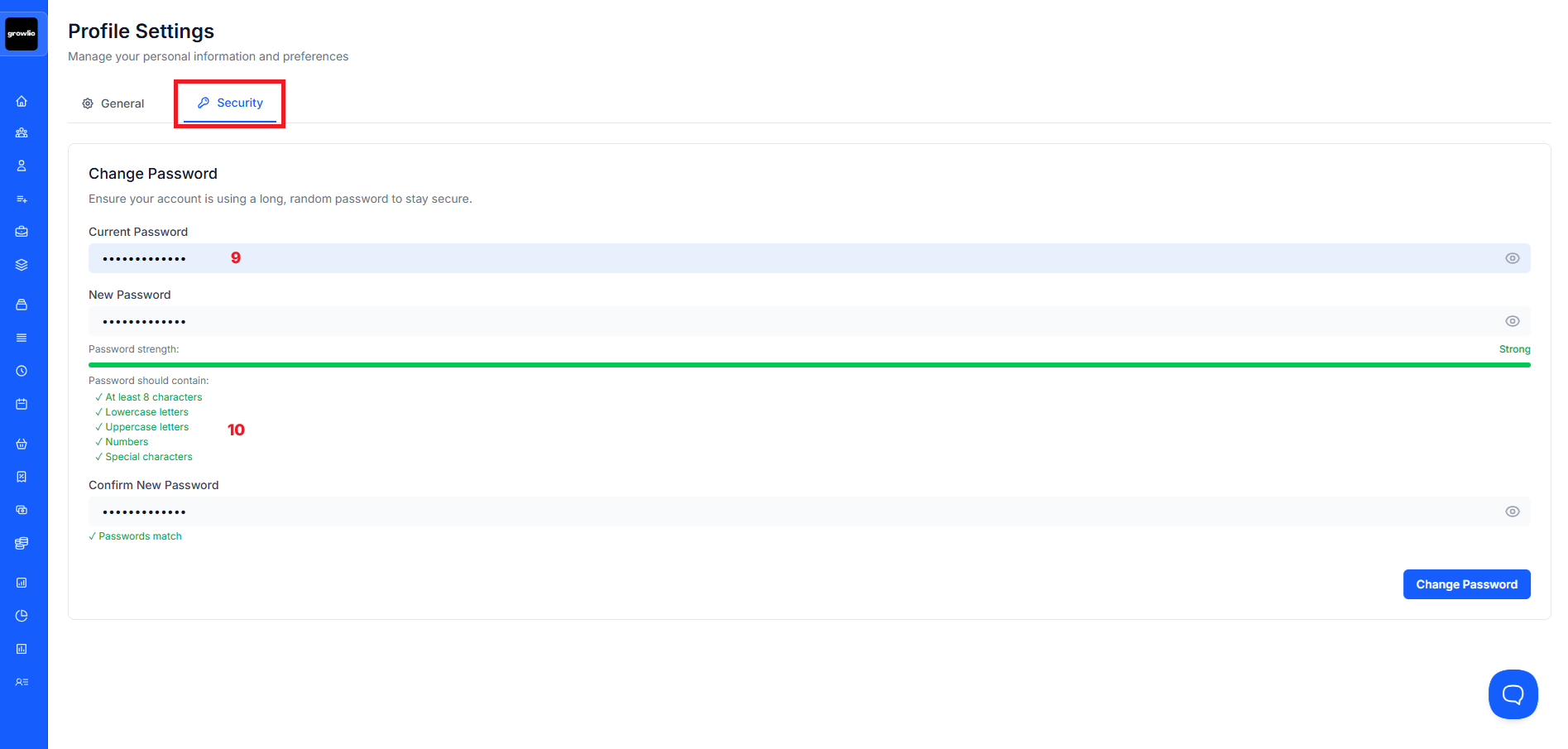 To change your password, enter your current password, then create a new password and confirm it. growlio will show you a password strength indicator to help you create a secure password.