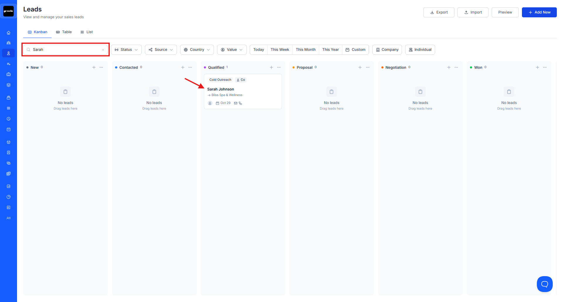 Tip: Search works across multiple fields simultaneously. Typing a company name finds all leads from that organization.