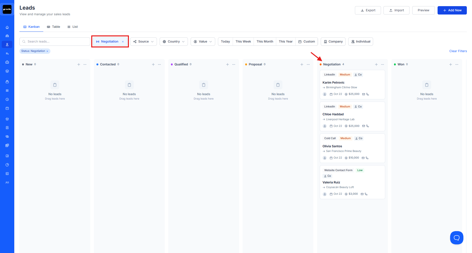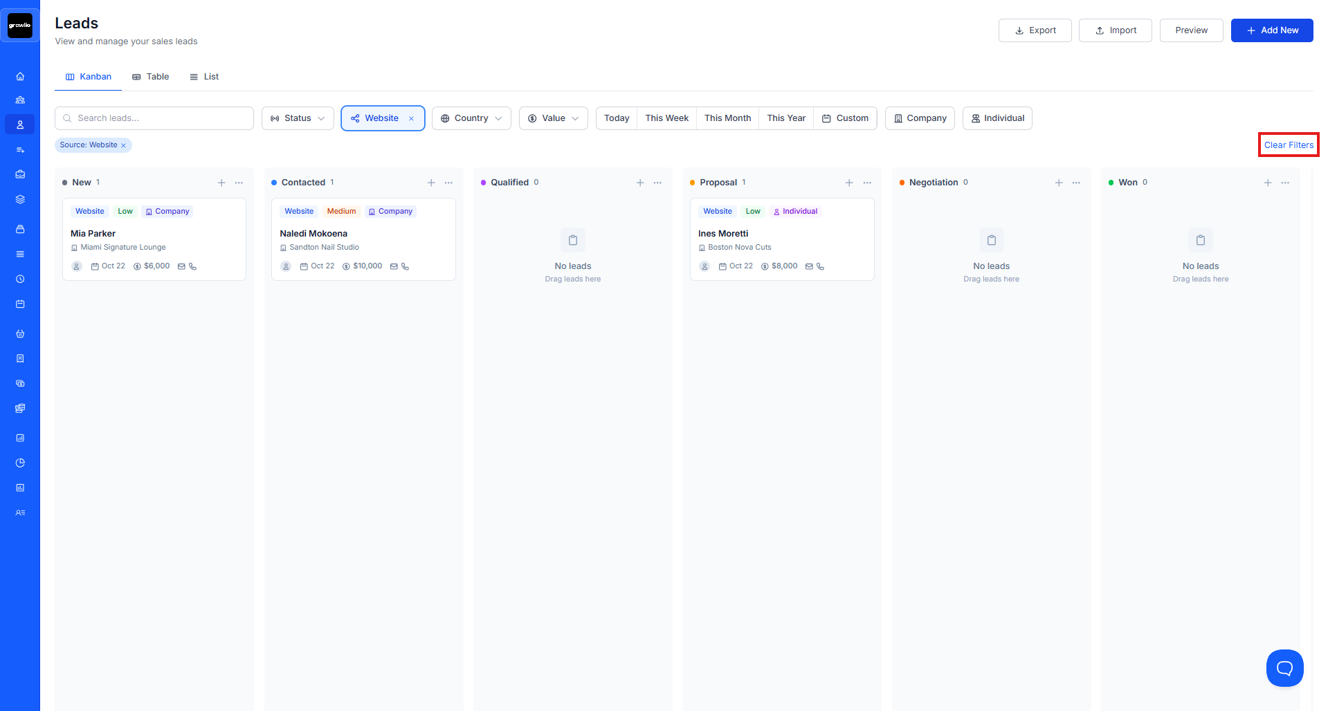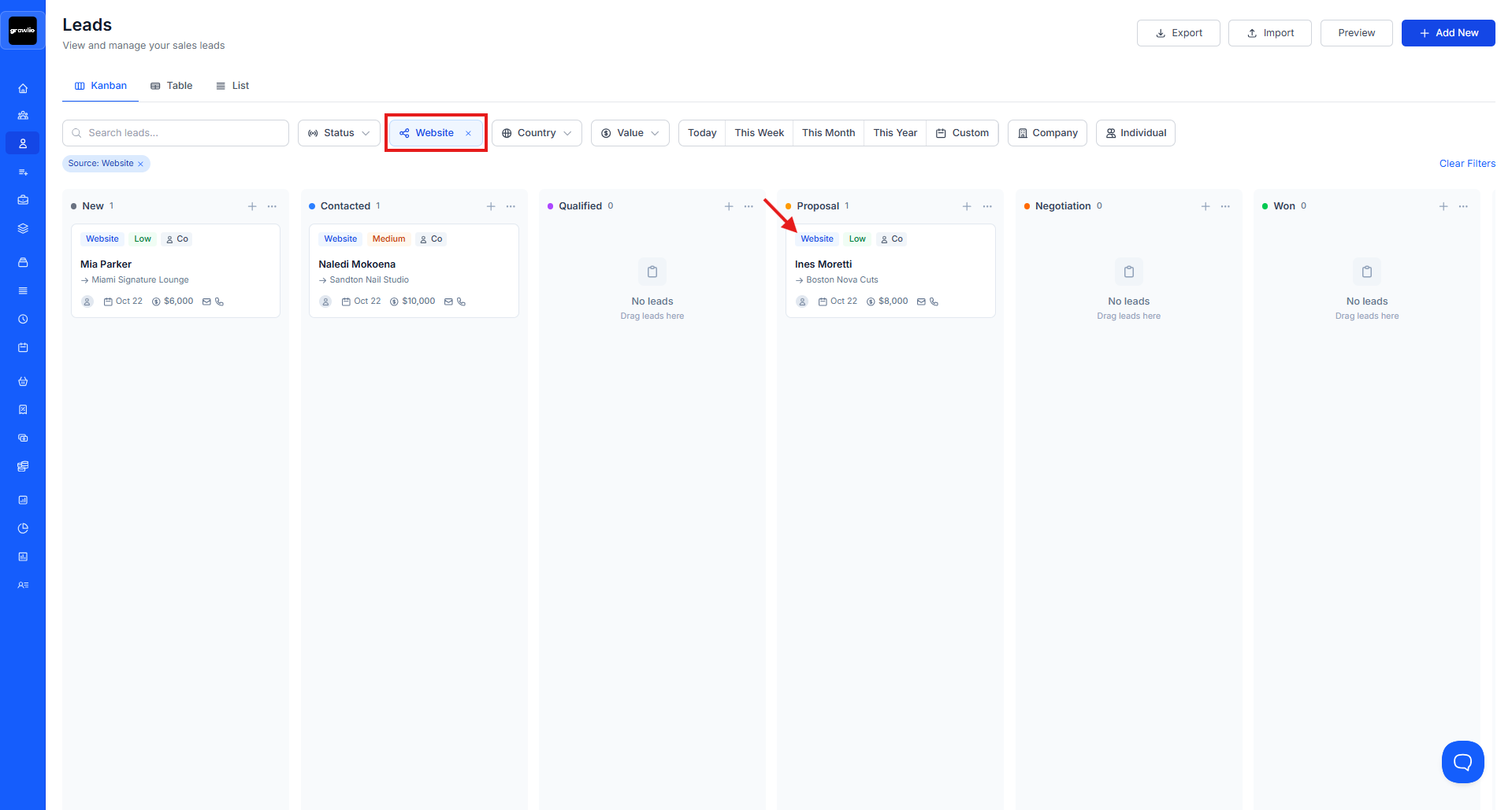 Use the "Source" dropdown to filter leads by how they came to you. Select Website, Referral, LinkedIn, or any other source you track to analyze which channels are most effective.
