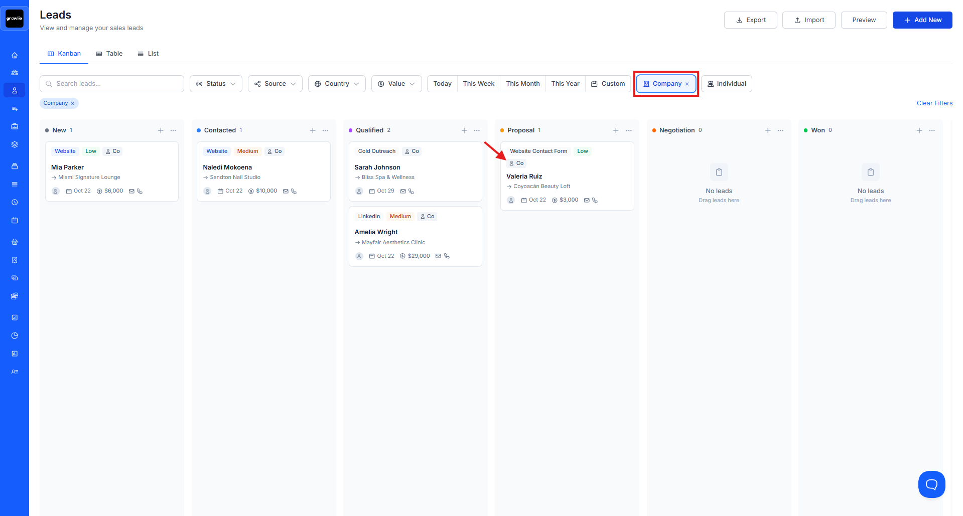 Select lead type (Company, Individual, Government, Non-Profit) to segment your pipeline. This is useful for tailoring your approach based on lead characteristics.