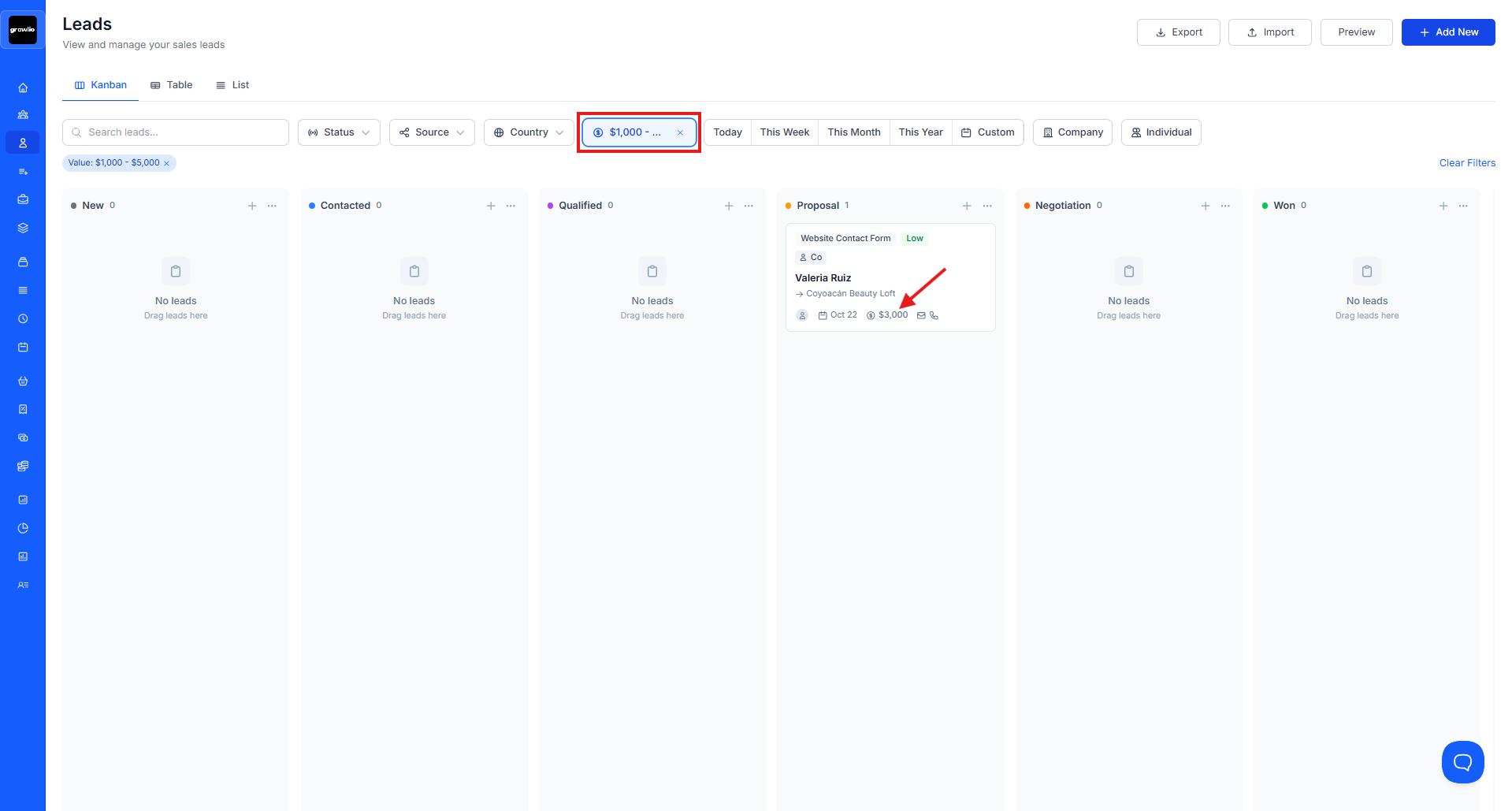 Filter leads by estimated value brackets to prioritize high-value opportunities. Select ranges like "$5,000 - $10,000" to focus on deals matching your target size.