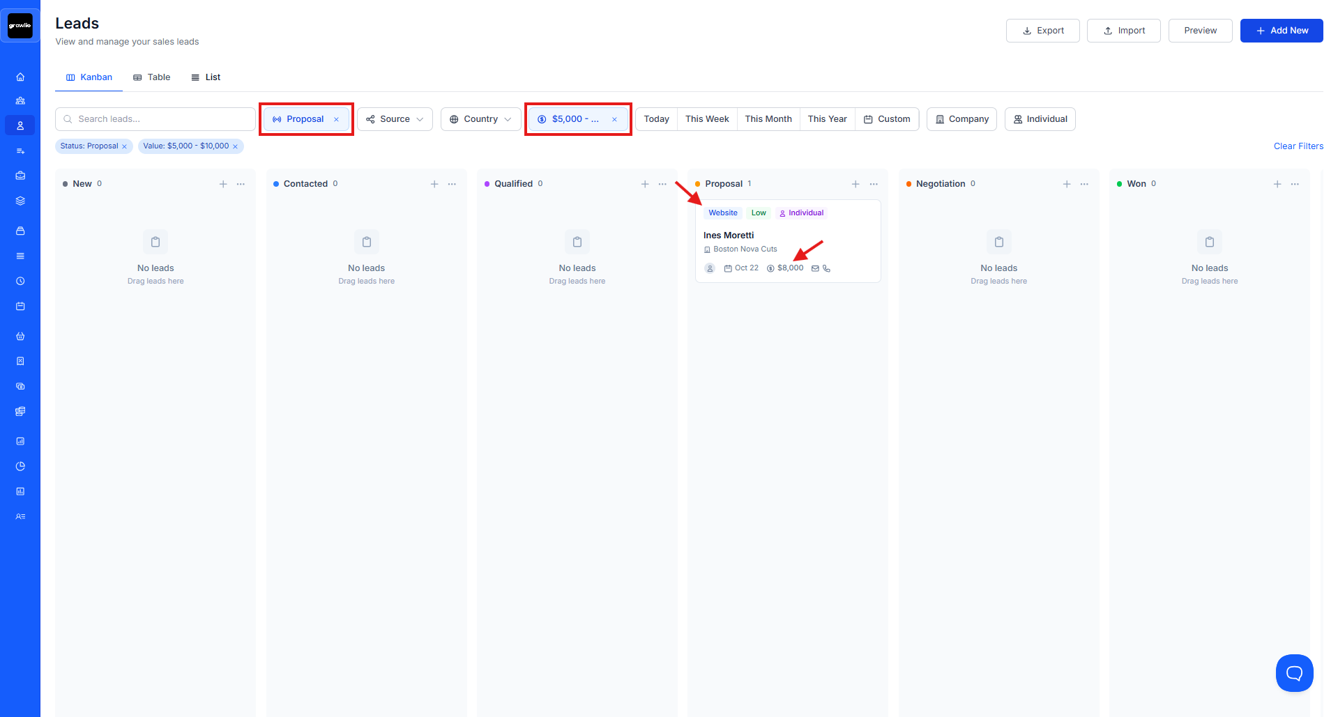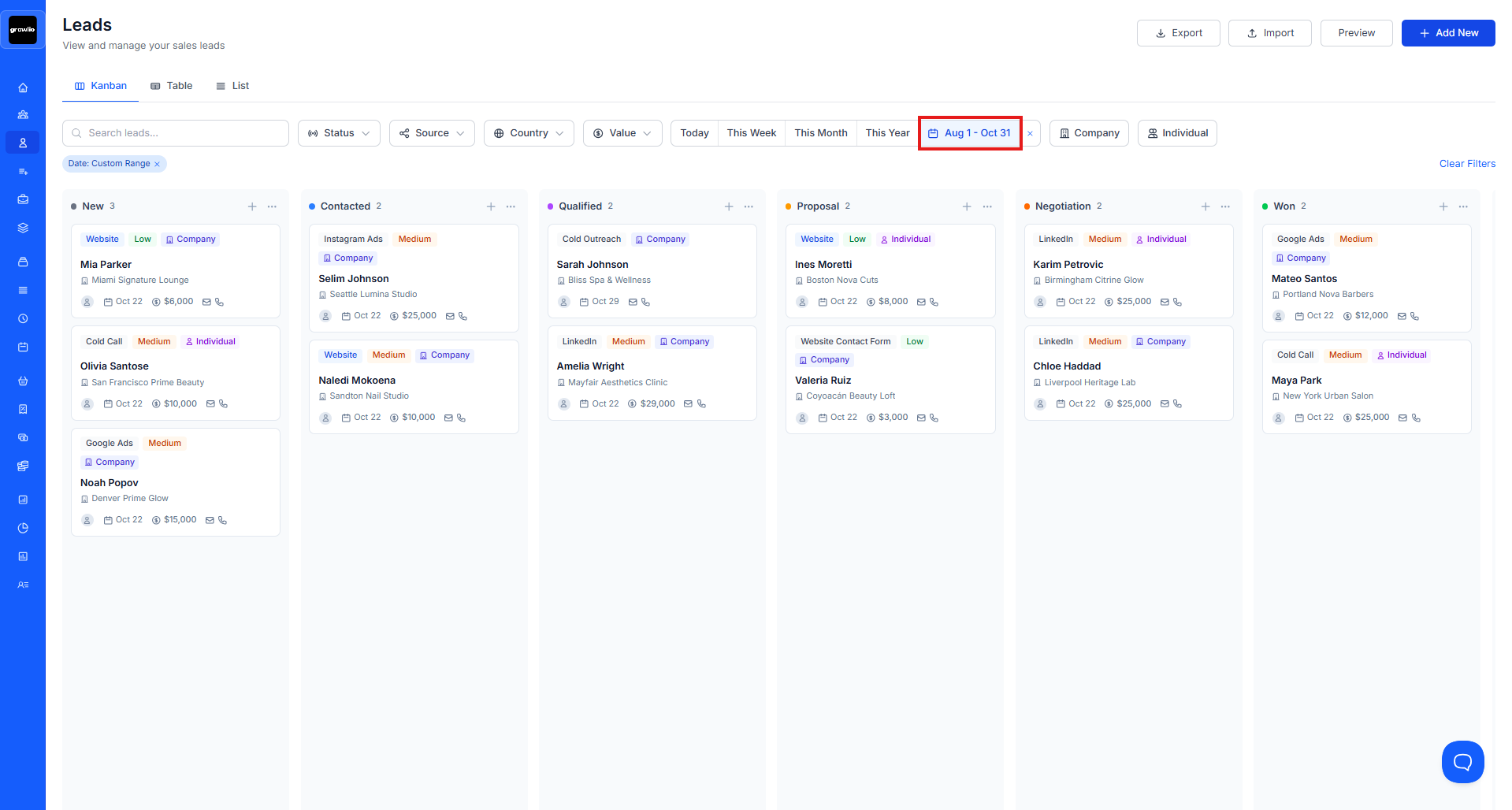 Tip: Date filtering helps identify leads that might need follow-up if they've been in the pipeline too long.
