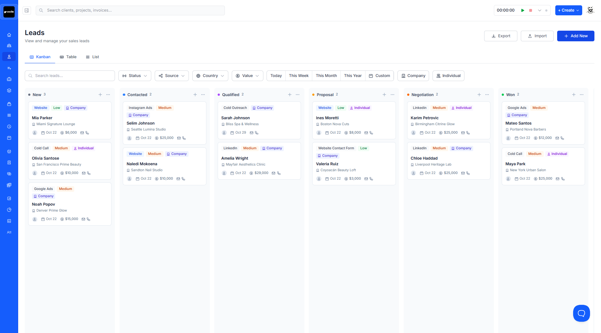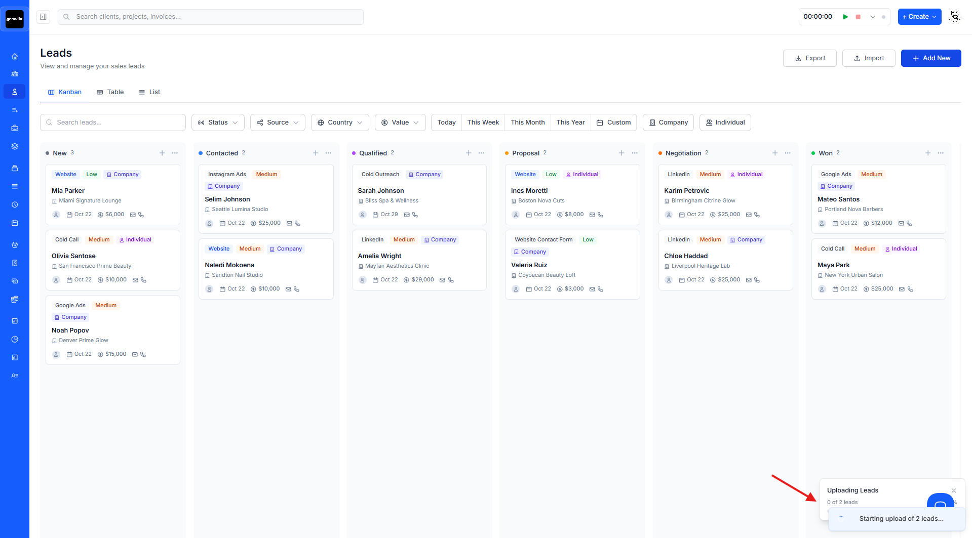 Go to Business > Leads from the main navigation. This displays your current leads list and provides access to the import functionality.