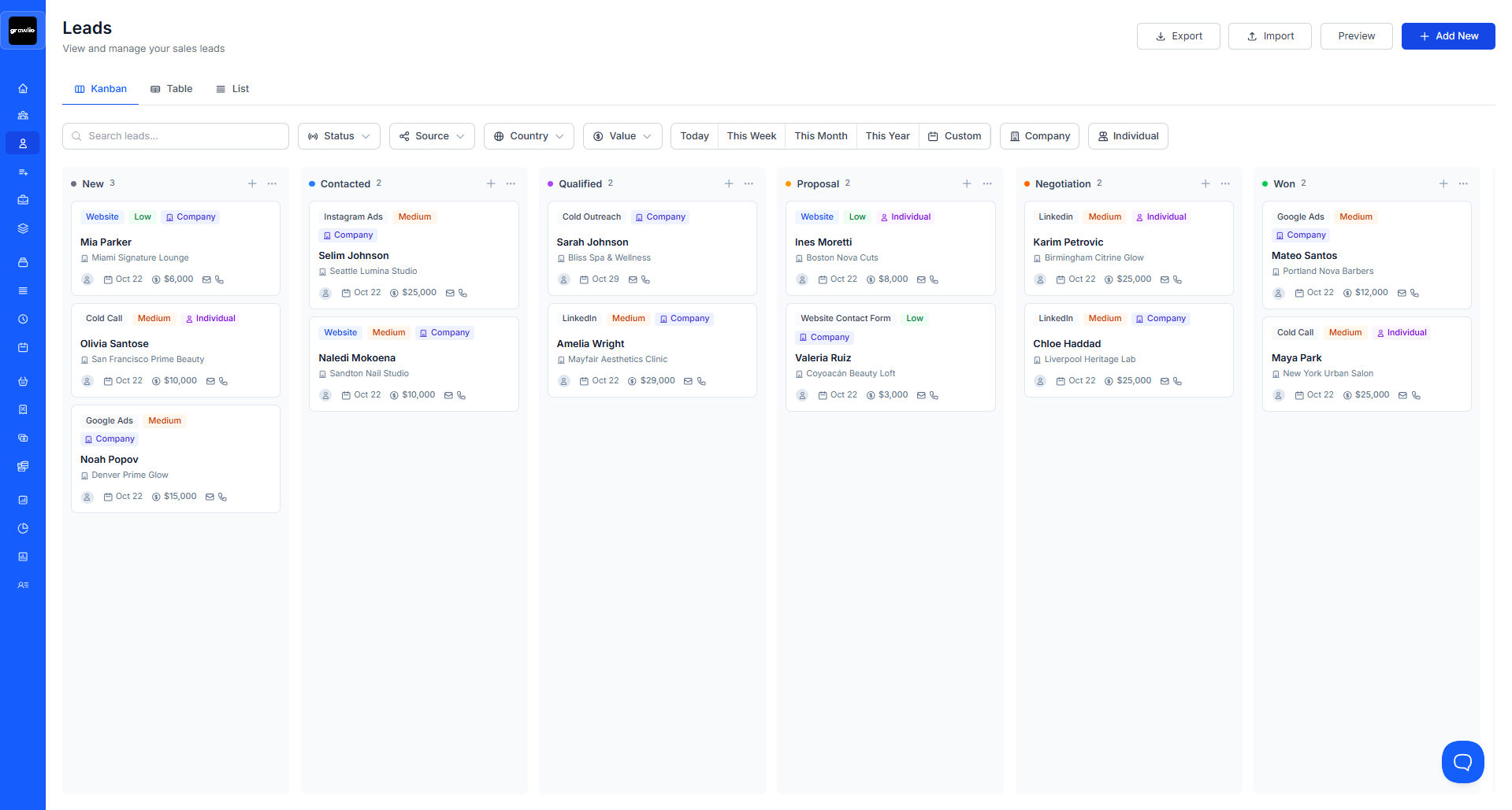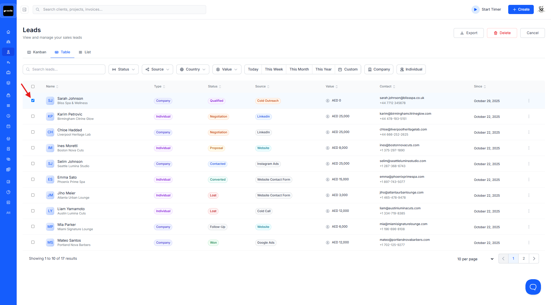 Go to Business > Leads to access your leads list. You can export from any view (Kanban, Table, or List), though Table view makes it easiest to see what data you're exporting.