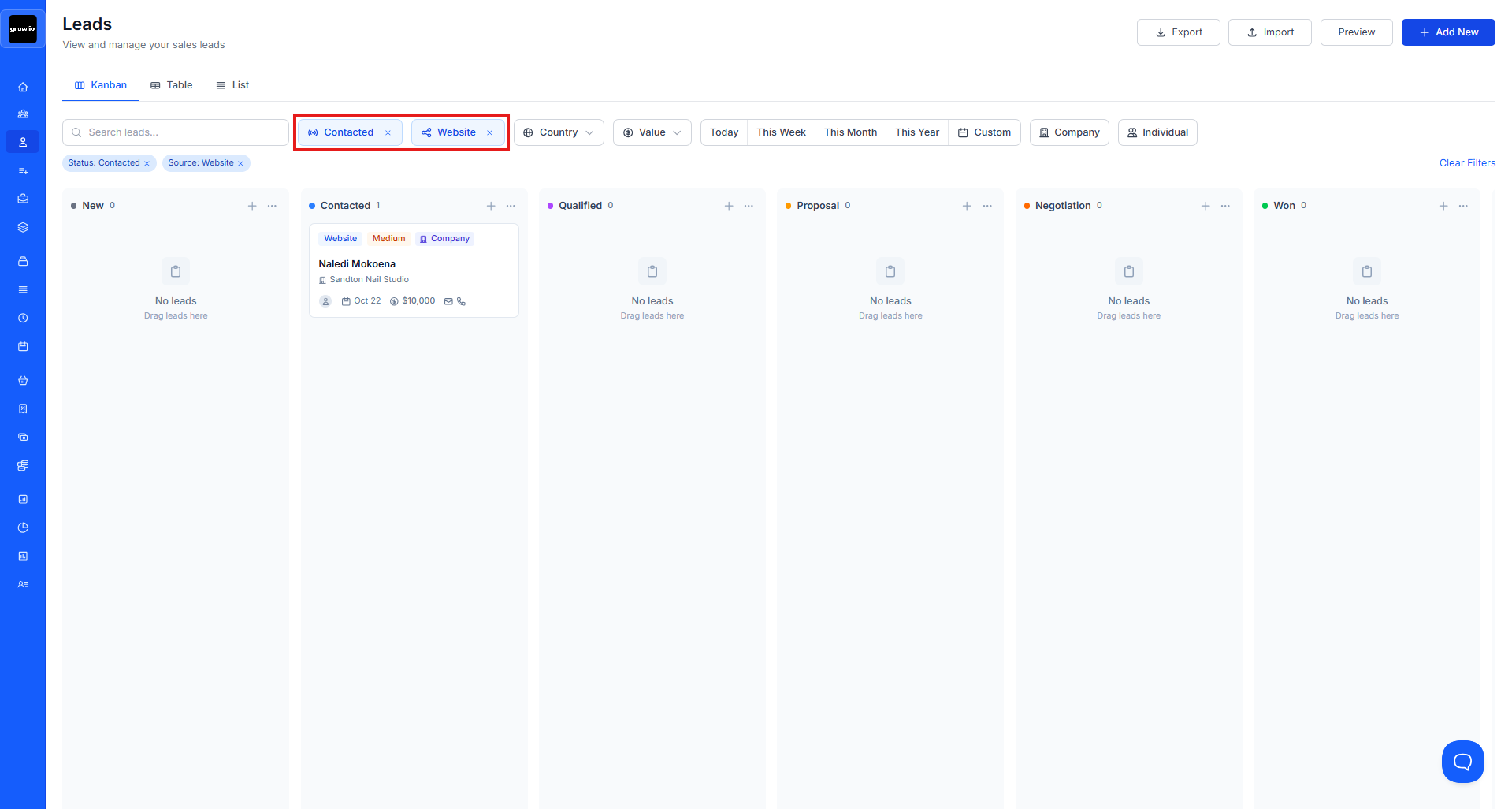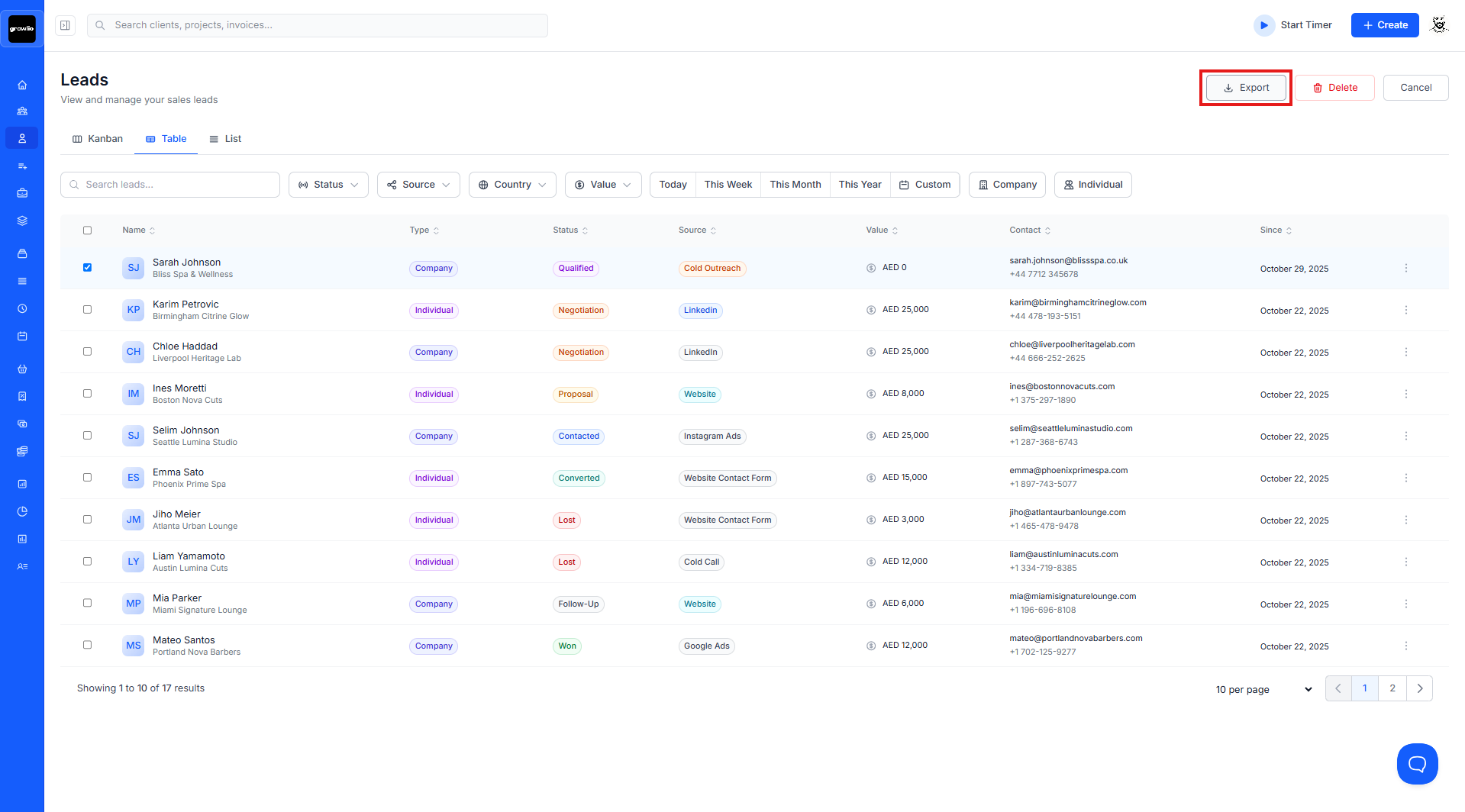 Use status, source, type, value, or date filters to narrow which leads to export. Your export includes only leads matching active filters.