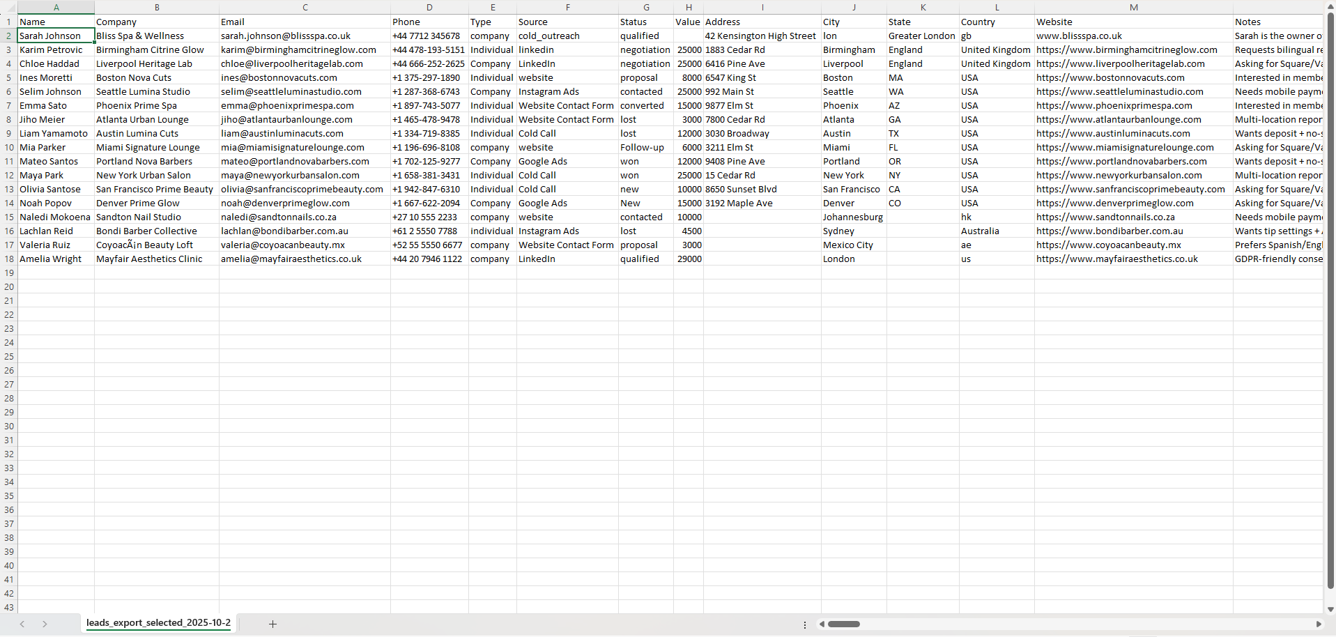 Check that all expected information exported correctly. Standard exports include: name, company, email, phone, type, source, status, value, created date, and notes.