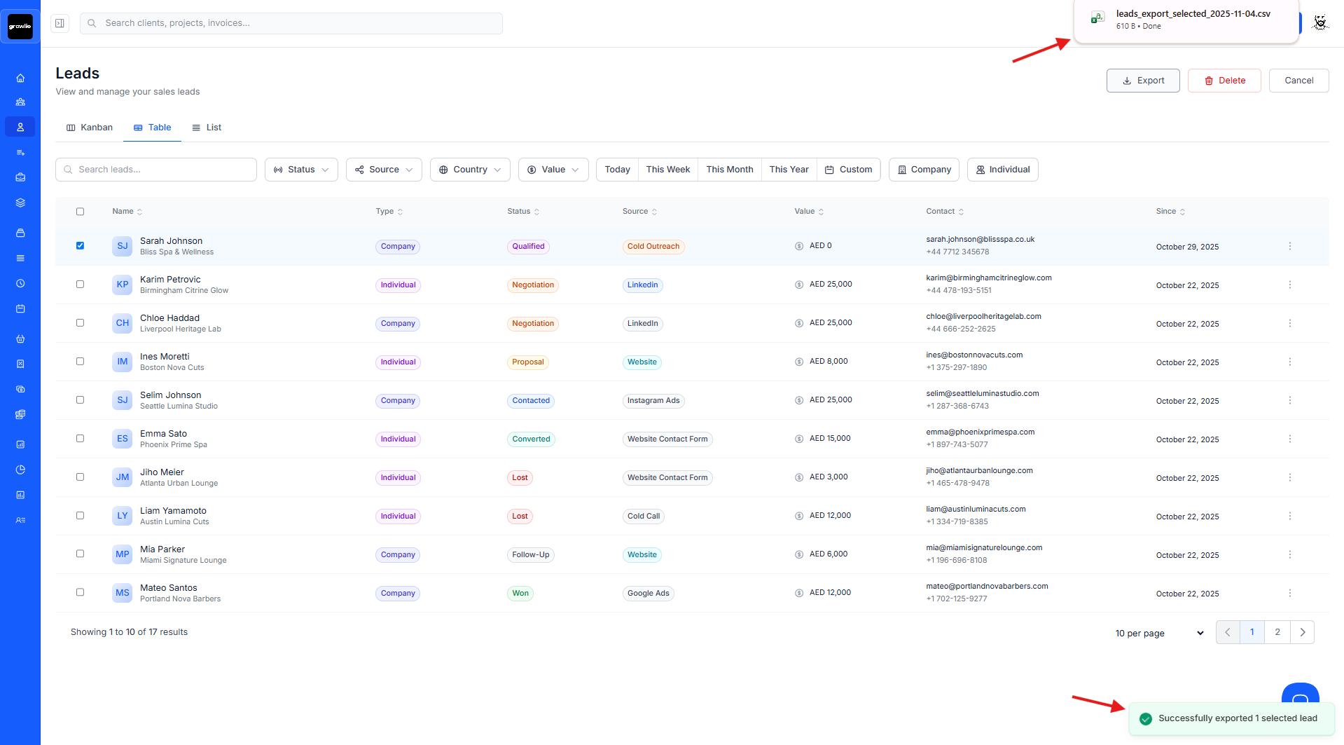 Your browser automatically downloads a CSV file with a name like "leads_export_2025-01-15.csv" including the export date for easy organization.