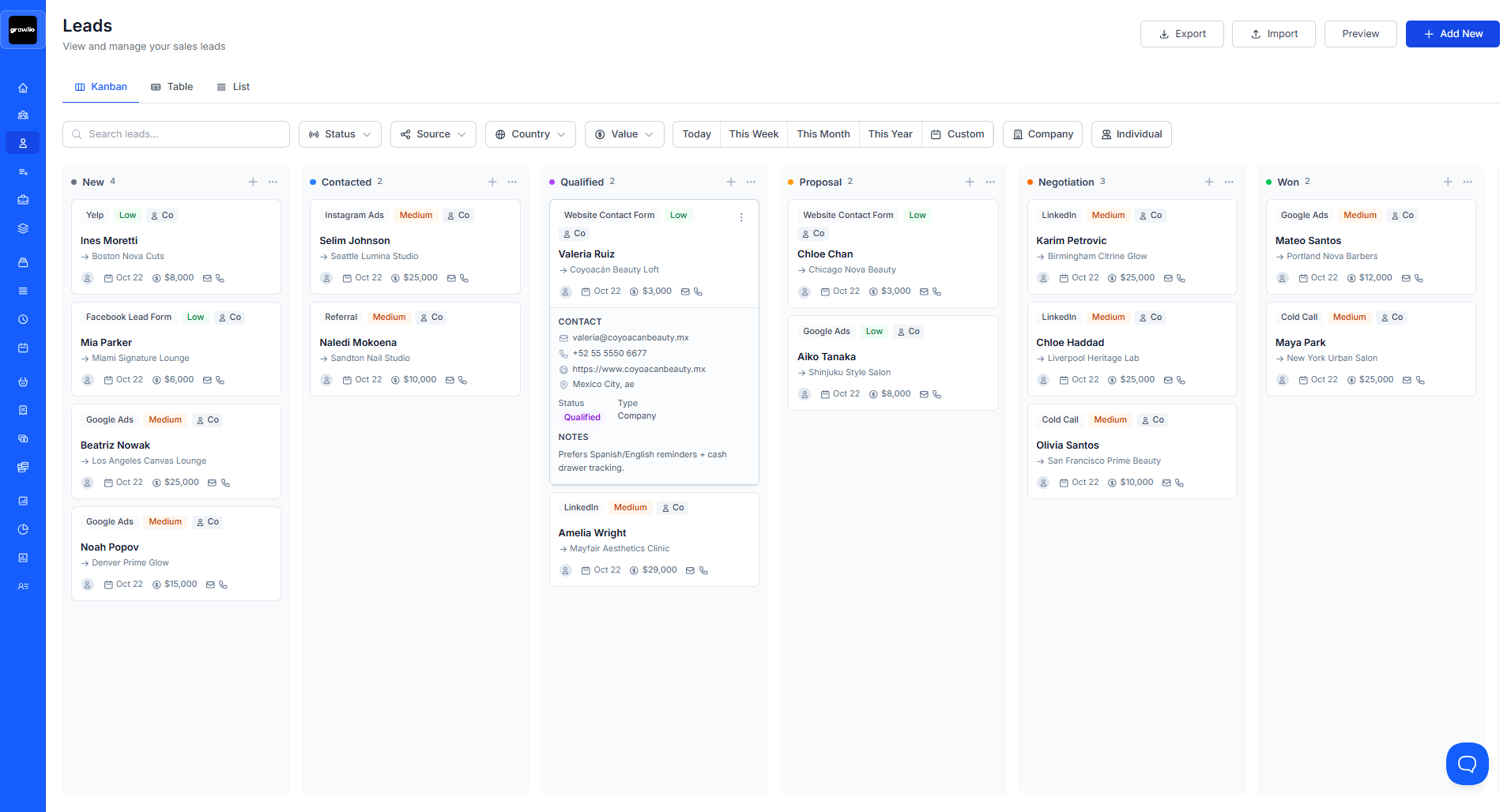 Navigate to Business > Leads to view your sales pipeline. You'll see leads organized by current status in Kanban view or listed with status columns in Table view.