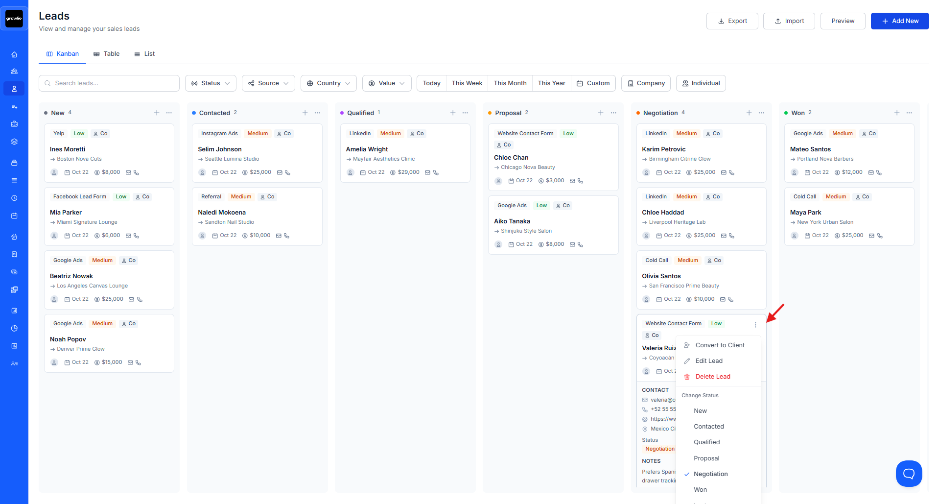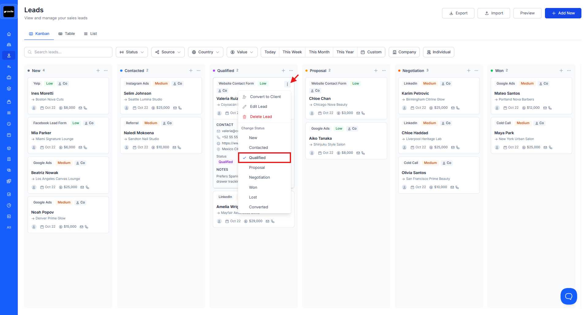 Tip: Status options in growlio typically include: New, Contacted, Qualified, Proposal, Negotiation, Won, and Lost.