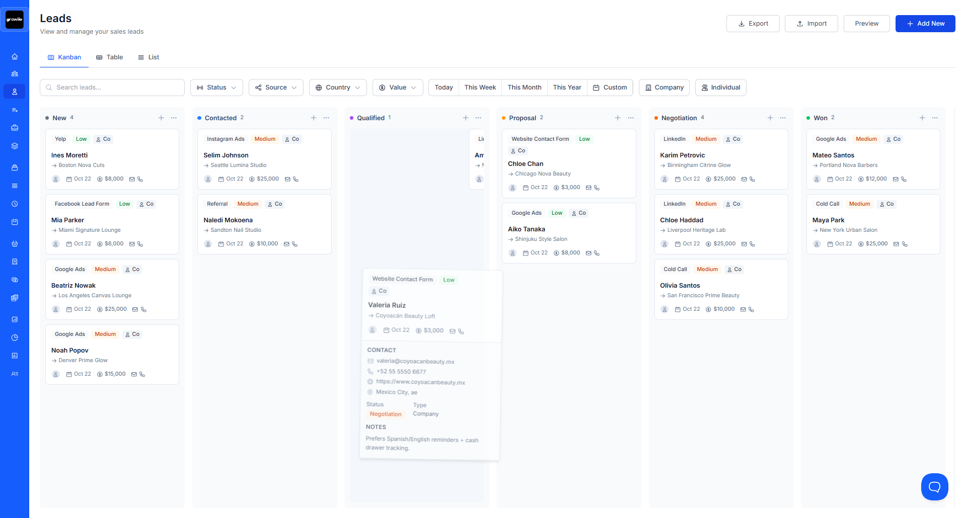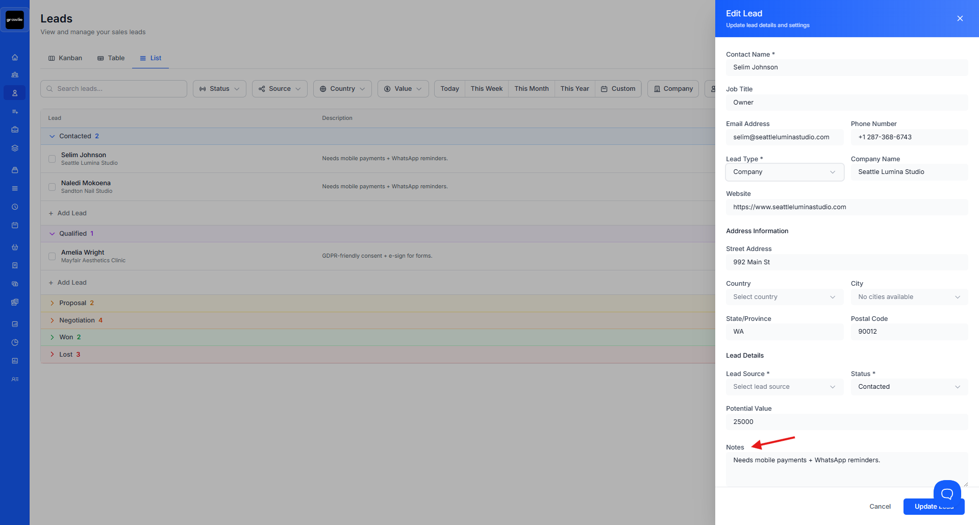 - Add notes when moving leads backward (e.g., from Proposal back to Contacted)