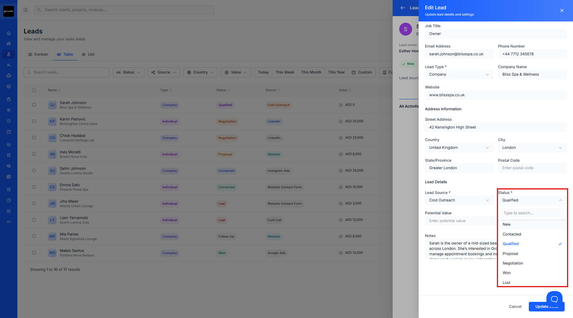 Summary: Update lead status to track progress through your sales pipeline and maintain accurate visibility into deal stages.