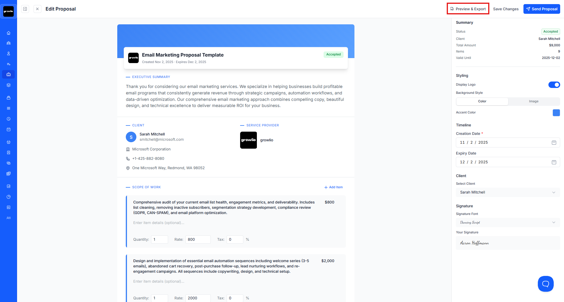 Find the "Preview & Export" button in the proposal actions menu. This is typically in the top-right corner.