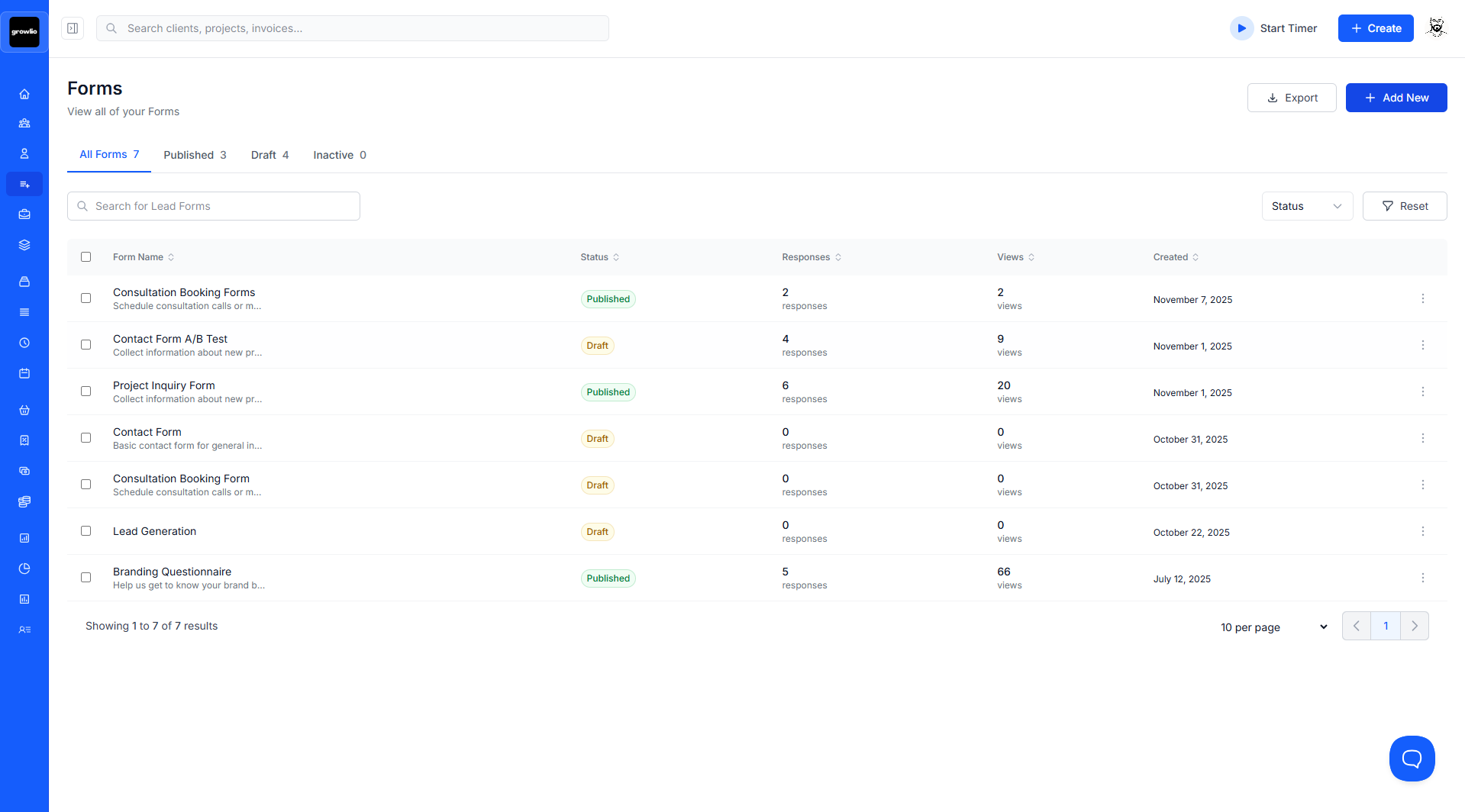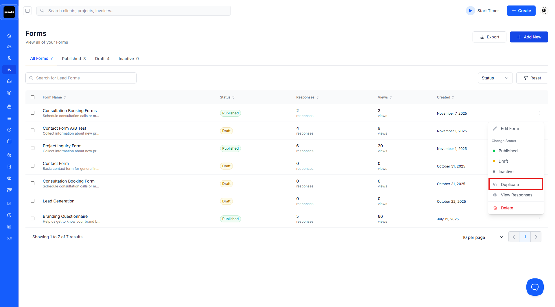 Select "Duplicate" or "Copy Form" from the actions menu. growlio creates an exact copy of the form with all fields, styling, and settings.